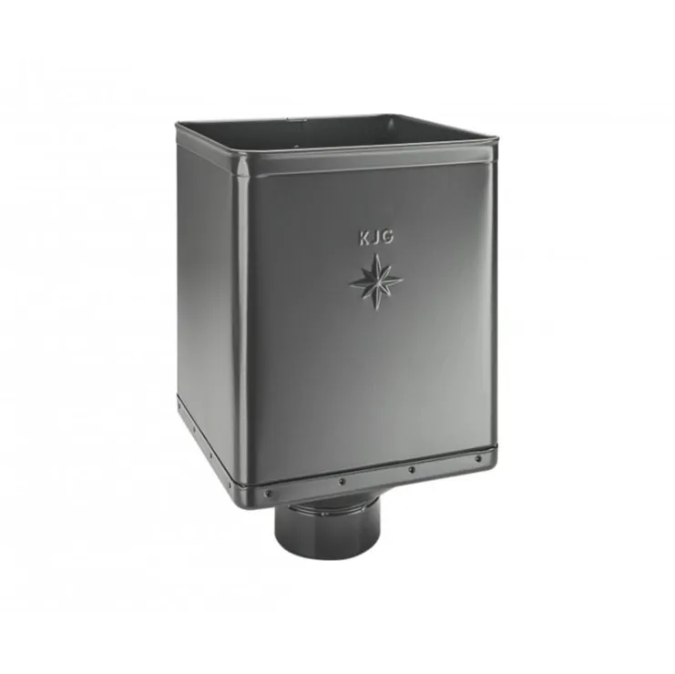KJG sběrný žlabový kotlík design slouží jako klasický kotlík, který odvádí dešťovou vodu do svodové roury. Do jeho otevřené horní části je možné zároveň vyústit i další svod, případně koleno z jiné střešní plochy. Zabezpečuje dilatační funkčnost žlabu, navíc tato varianta svým excentrickým designem umožňuje instalace v atypických řešených svodech. Kotlík je možné umístit kamkoliv do žlabu.Použití sběrného hranatého kotlíku je individuální a závisí ve velké míře na projektantovi, na objektu, na požadavku zákazníka.