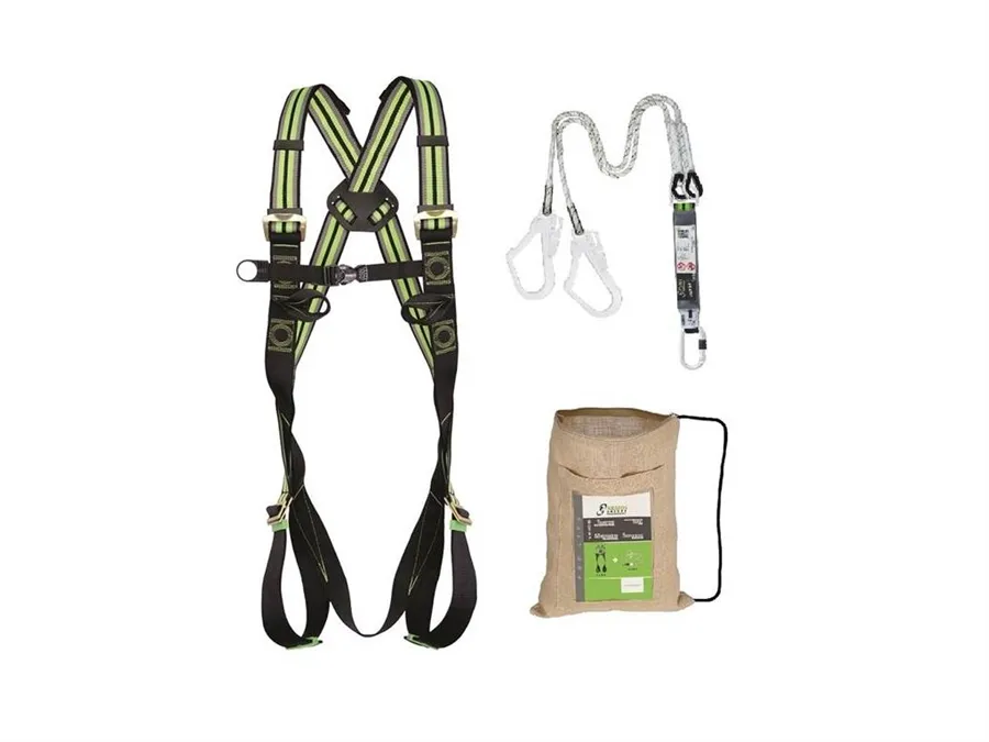 Souprava pro práce na ocelových konstrukcích. Nepostradatelný pomocník při práci, kde pracovník mění svoji pozici a je nutné se často zajistit a odjistit.