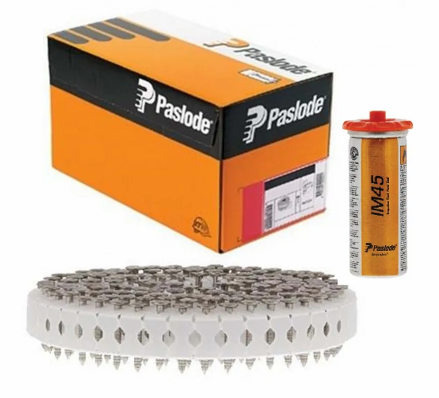 Kroužkové pásové hřebíky do plynové hřebíkovačky Paslode IM90i. Rozměr hřebíků 2,8 x 63 mm.