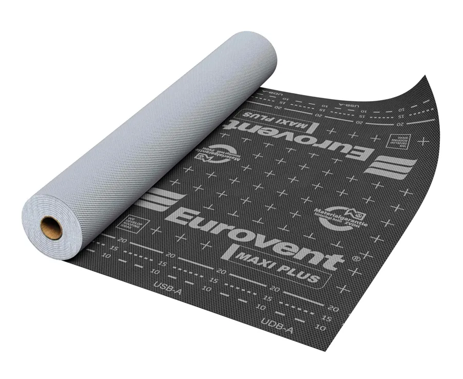Střešní membrána Eurovent® MAXI PLUS s lepící páskou, třívrstvá, vysoce difúzní, používá se na šikmých střechách se zateplením a odvětráním, rovněž s plným bedněním. Zvýšená odolnost proti protržení, což zvyšuje uživatelský komfort. Je vhodná pod střešní krytiny, jako jsou betonové, pálené tašky, plechová krytina, hliníkové plechy, a rovněž na stavbách s rámovou konstrukcí.