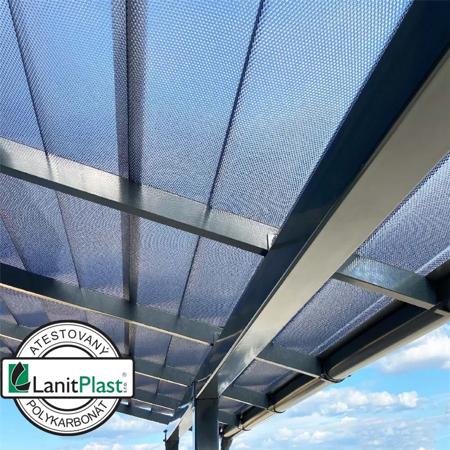 MARLON CSE Diamond Z-TOP - rychlé a snadné zastřešení! Montáž přímo na krokve! Extrémně robustní vlnité polykarbonátové desky síly 2,8 mm s povrchovou strukturou - vytlačené šestihrany podobné plástvím na vnitřní straně určené pro rozptyl světla. Povrchová struktura láme světlo, takže desky nejsou úplně průhledné, ale průsvitné a vzniká pod nimi příjemný jemný chládek při zachování světelné propustnosti. Část paprsků díky svému lomu na krupičce zůstane v materiálu, takže se panel při nasvícení sluncem rozzáří. Povrchová struktura je vyrobena mechanicky vylisováním na vnitřní povrch panelu.