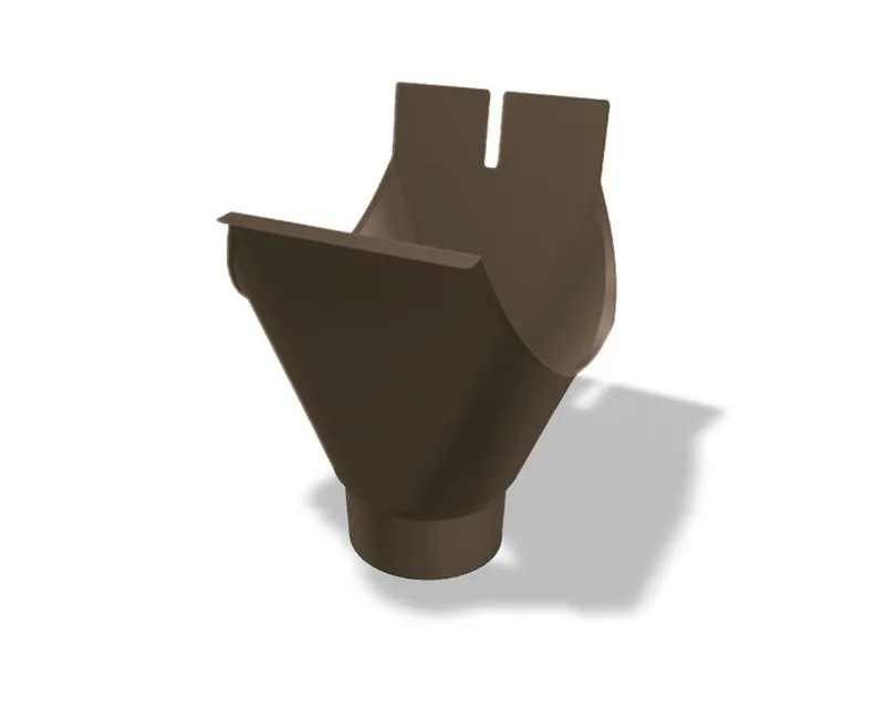 Kotlík (přechodový díl) z hliníkového okapového žlabu rozvinuté šíře 250 mm na svod o průměru 80 mm značky Prefa. Barva P.10 tmavě hnědá.