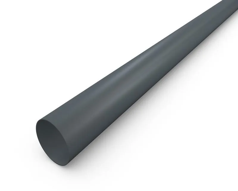 Hliníkový okapový svod o průměru 80 mm, délky 3 m, značky Prefa. Barva P.10 tmavě šedá.
