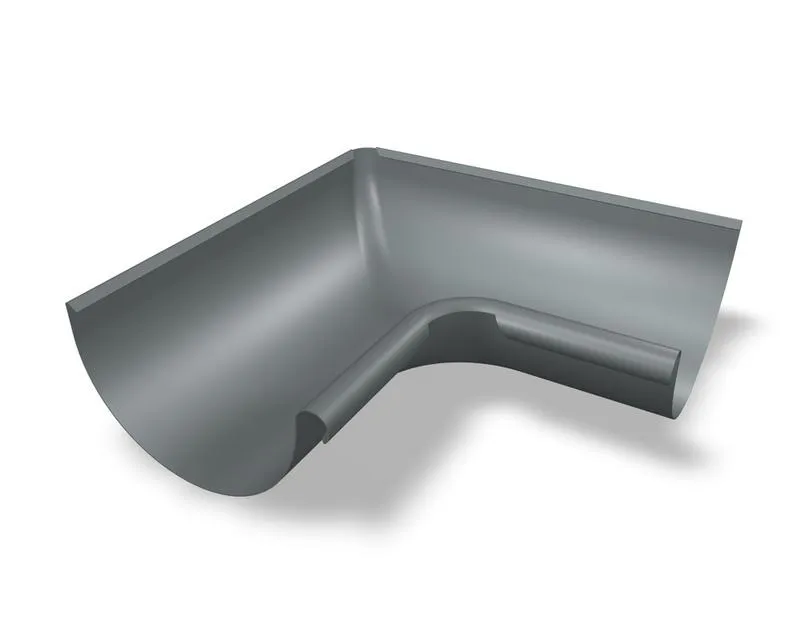 Vnější roh k hliníkovému okapovému žlabu rozvinuté šíře 250 mm značky Prefa. Barva světle šedá.