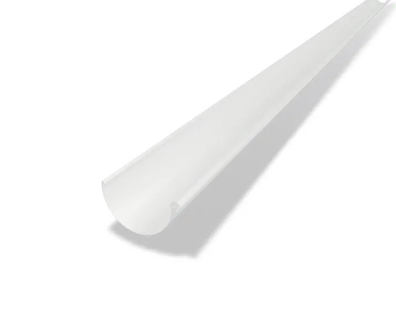 Hliníkový okapový svod o průměru 100 mm, délky 3 m, značky Prefa. Barva světle šedá.
