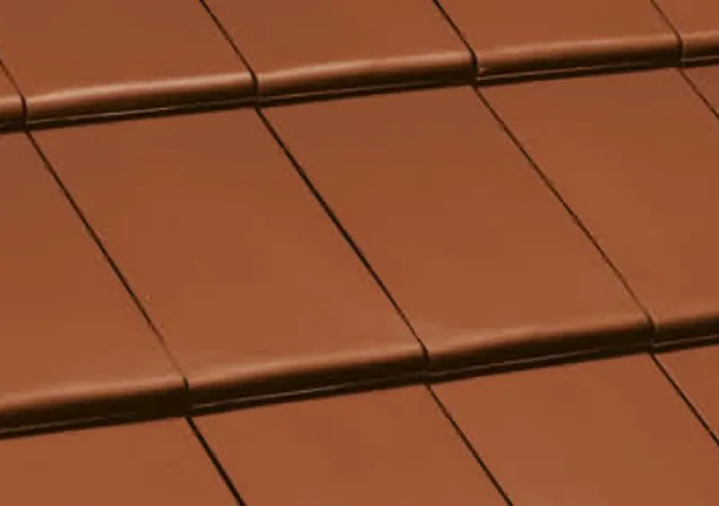 Pálená střešní krytina od firmy Nelskamp s rovným moderním profilem. Povrchová úprava červená engoba.