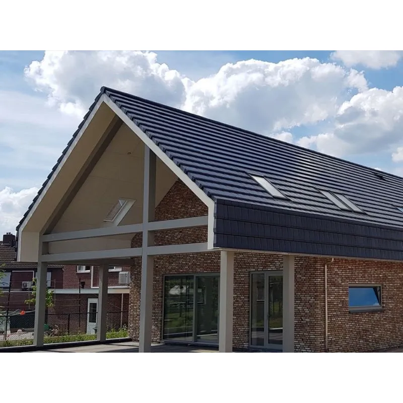 Pálená střešní krytina od firmy Nelskamp s rovným moderním profilem. Povrchová úprava staročerná engoba.