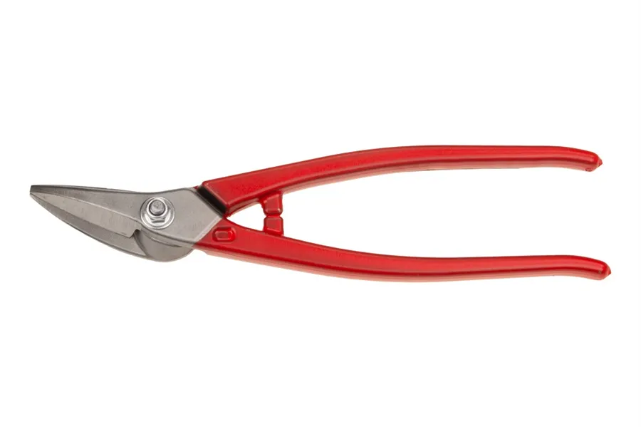 Stubai ruční klempířské nůžky levé s vyosenou spodní čelistí umožňující pohyb stříhaného i odstřihovaného plechu pod rukojeťmi.